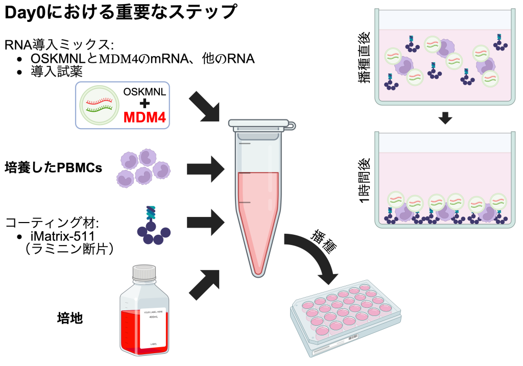 この方法では、day0に細胞の回収・RNA導入・プレートへの播種を同時に行うことで手順の簡略化と導入効率の上昇?の効果があると考えています(下のイメージ図)。