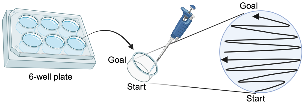 継代作業の時、TrypLE処理後にPBS(-)でwashし、培地(StemFit AKl3N)を加えてスクレーパーでhiPSCを回収するのが常法となっていると思いますが、6-wellの1 wellだけを処理するのであれば、ピペッティングだけで回収できます。PBS(-)でwashした後、1 mLのAK03Nをピペットマンで吸い、傾けたwellの下の方から培地を噴出させて細胞をwellから剥がしていく感じです(下の図のStartからGoalに向かって)。TrypLE処理後はwell上が白く見えるので、細胞が剥がれる様子は分かり易いと思います。