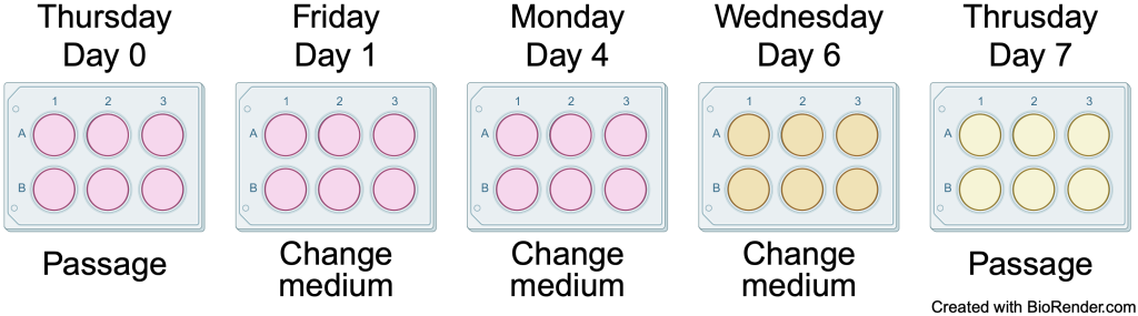 継代翌日以降の培地交換の際に培地量を通常の倍に増やすと、3日に一度の培地交換でも細胞の形態・増殖にほとんど影響がないようです(例 培地量:3 mL/well of 6-well plate))。Day6で培地の色がオレンジ〜黄色になっていたら培地交換をしています。Day1の培地交換は播種後24時間ちゃんと経過してから行ったほうが良いです。木曜日に継代を開始した場合、金曜日に培地交換をすれば、土日は何もしなくて大丈夫です。月曜日に培地交換して、その後は培地の色を見て適宜培地交換を行ってください(下の図は培地の色のイメージです)。